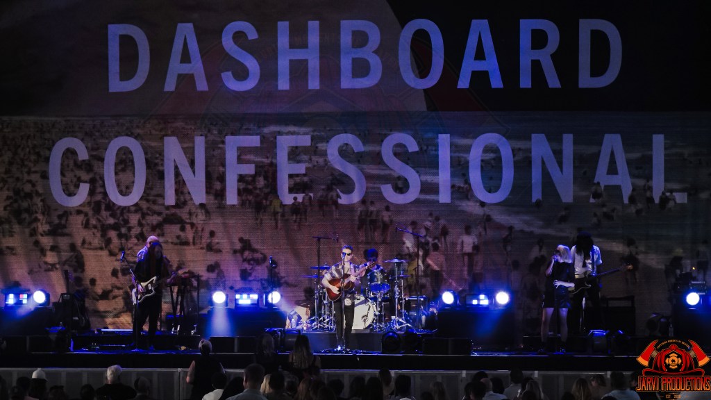 The night kicked off with Dashboard Confessional, who immediately set the tone with a set that blended beloved classics with newer material. Chris Carrabba’s heartfelt vocals carried across the amphitheater, prompting the crowd to sing every lyric with passion. From the first strum of the guitar, it was clear that this was not just a warm-up act this was a co-headlining performance in spirit. For a solid hour, the audience was on their feet, clapping, swaying, and shouting choruses back to the band. The atmosphere was electric, a mix of summer warmth and musical adrenaline.